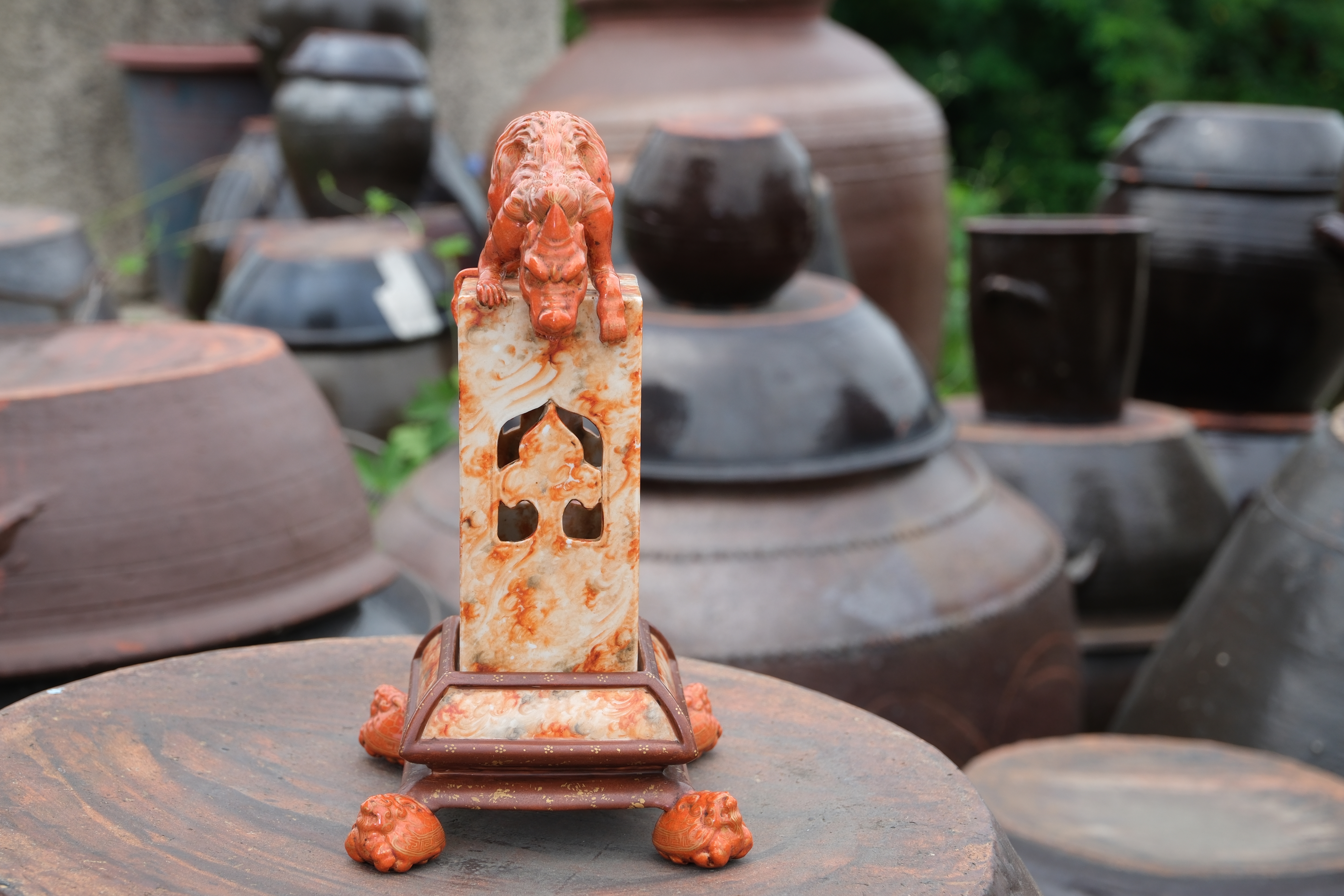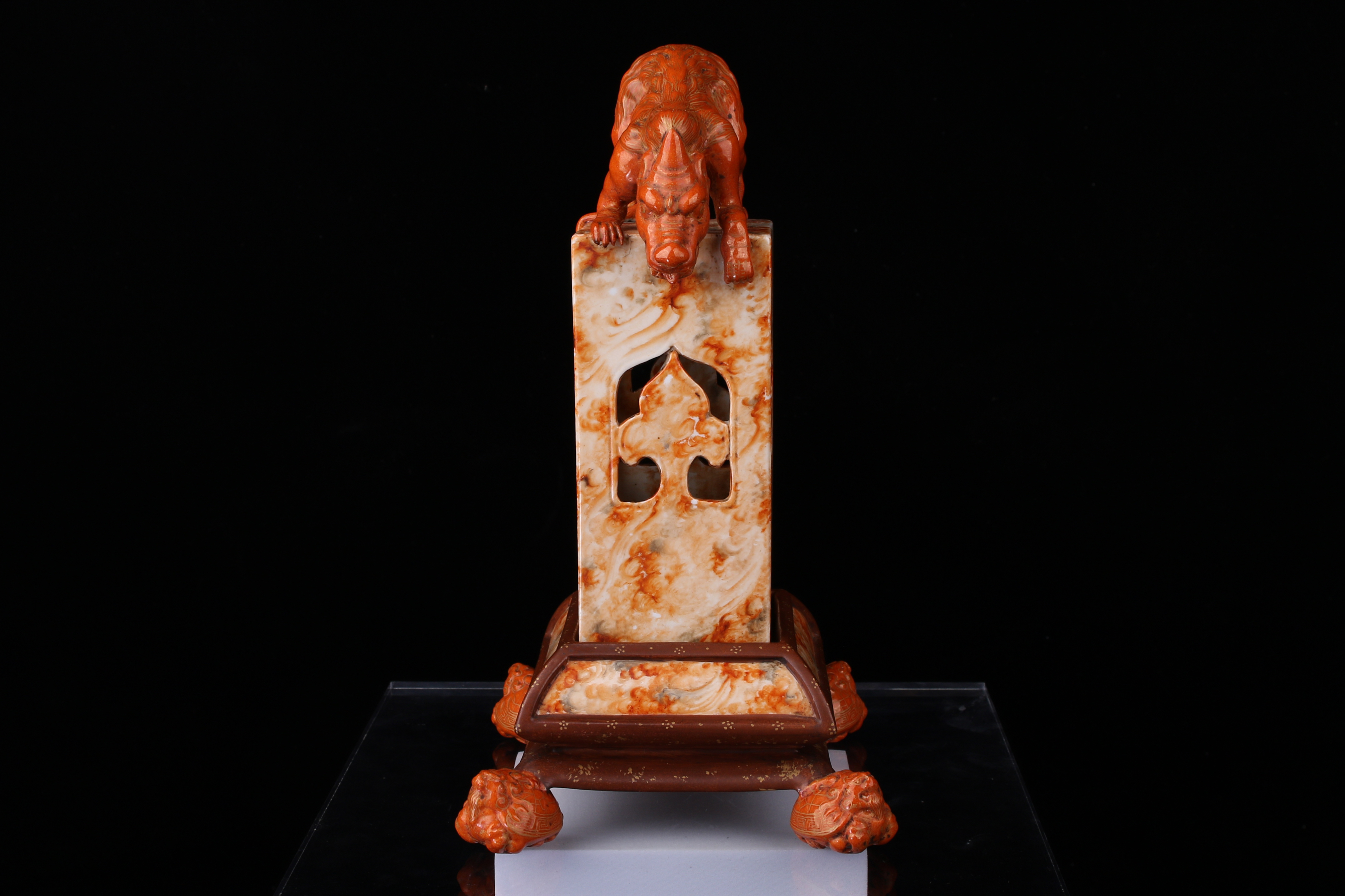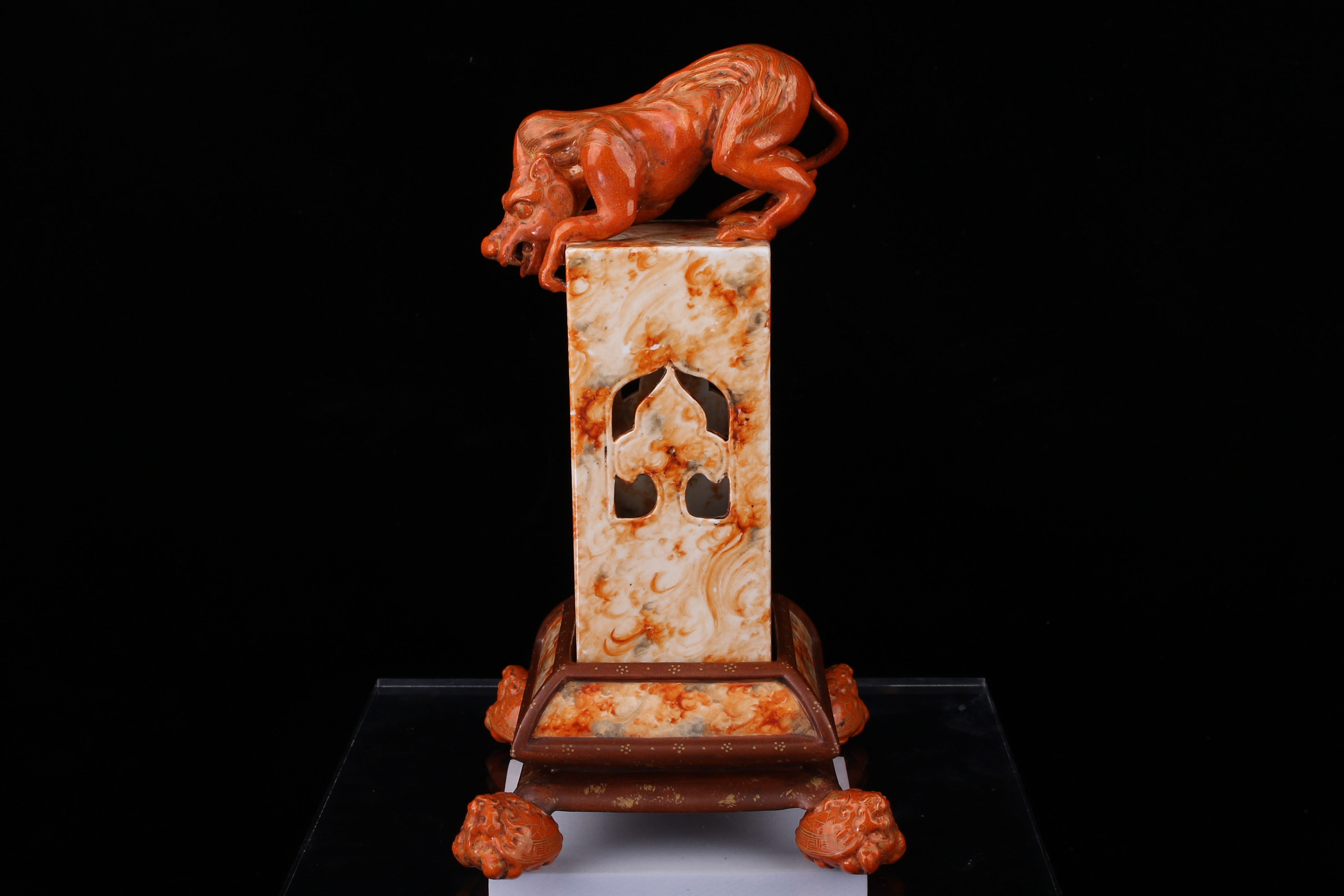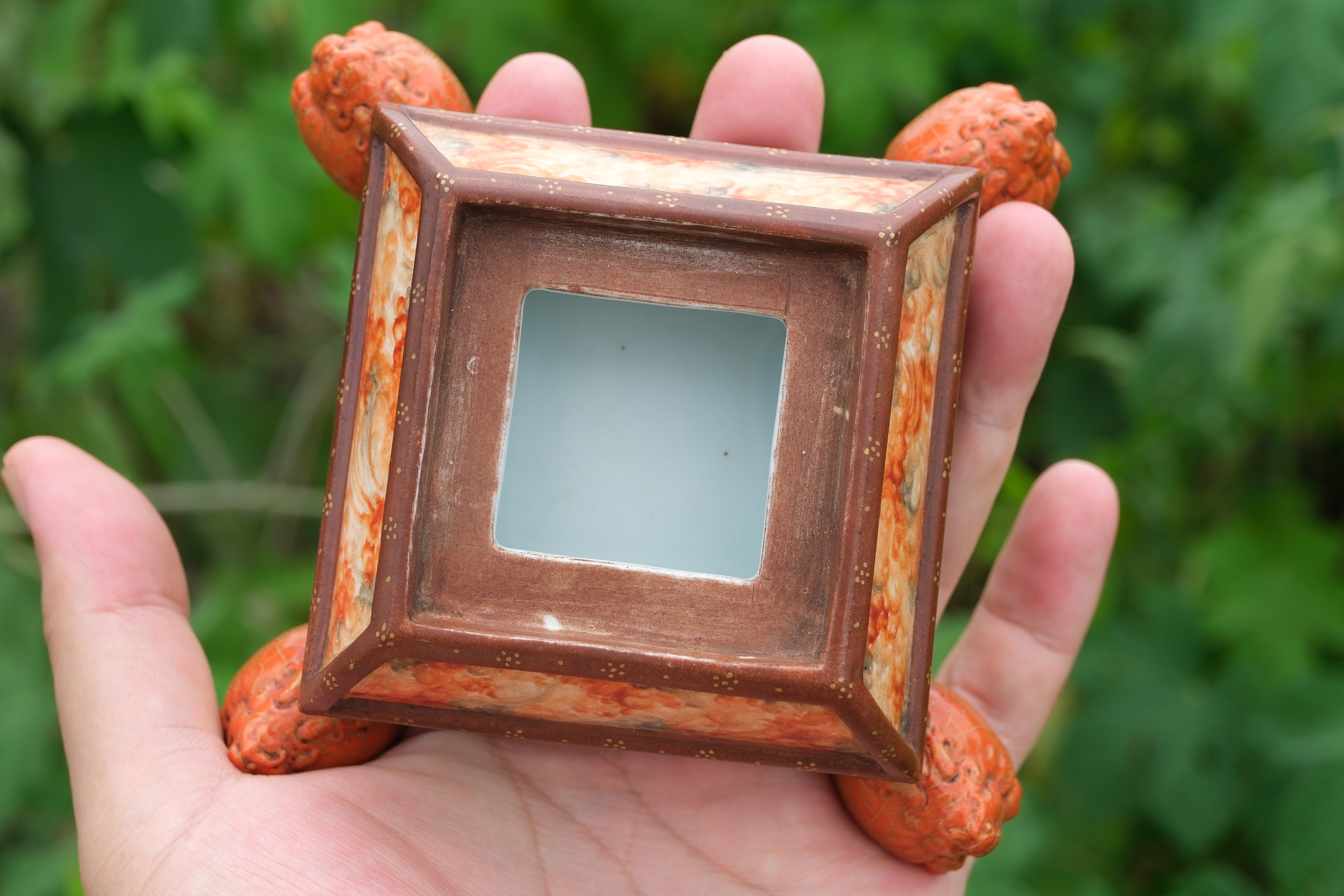 0214 Qianlong-Mark Porcelain Censer with Foo Lion Finials & Wood-Grain Glaze