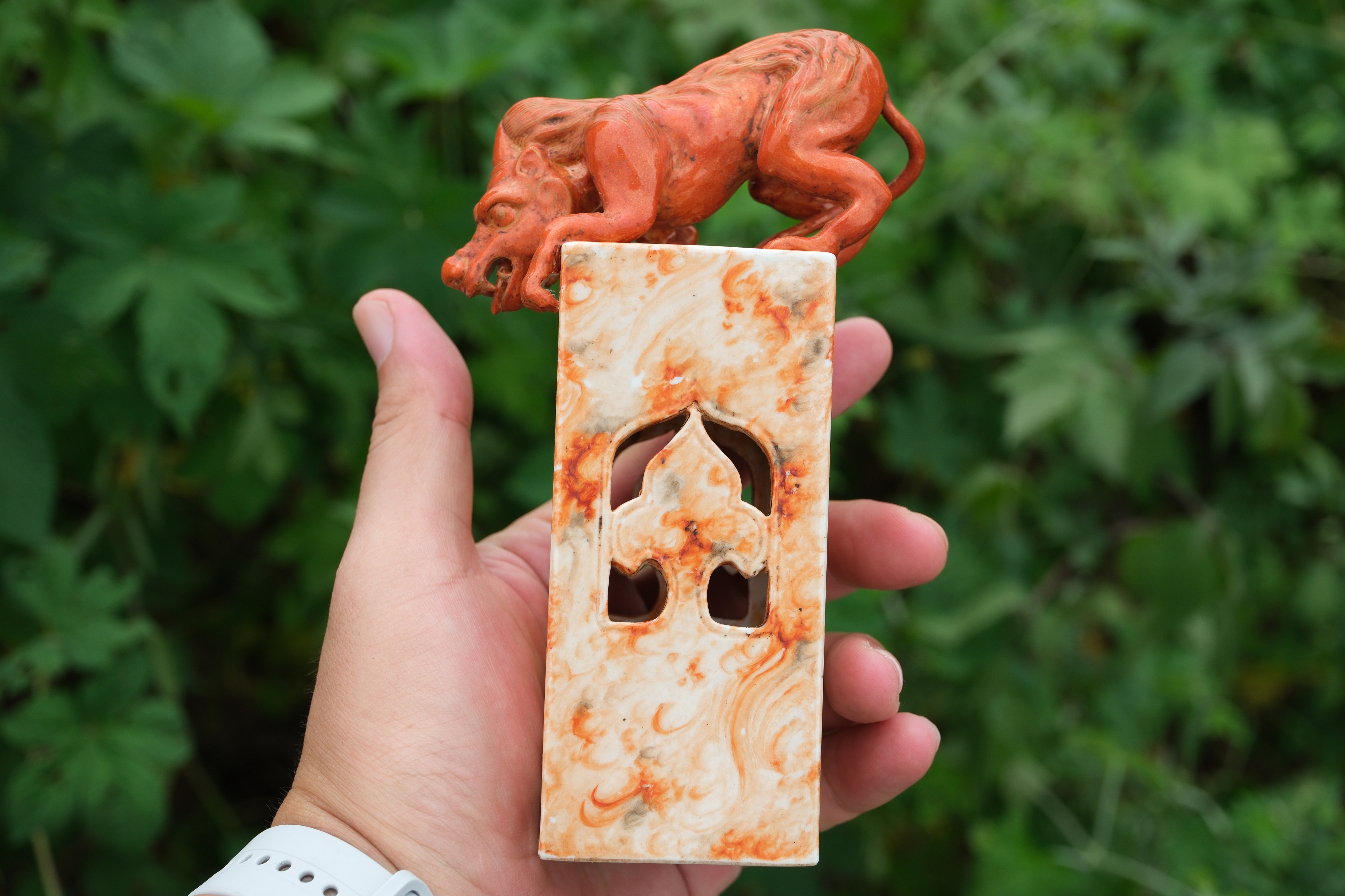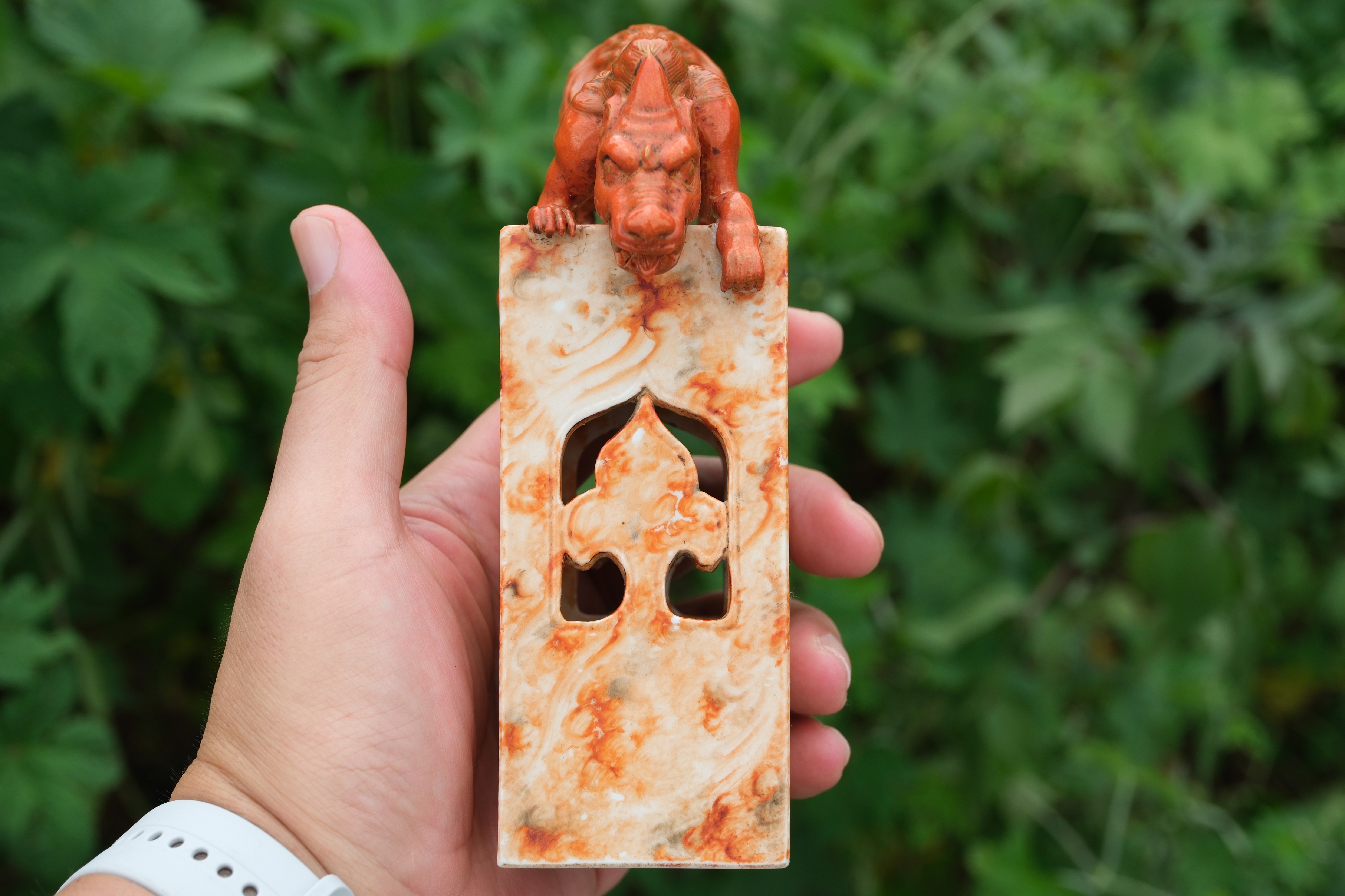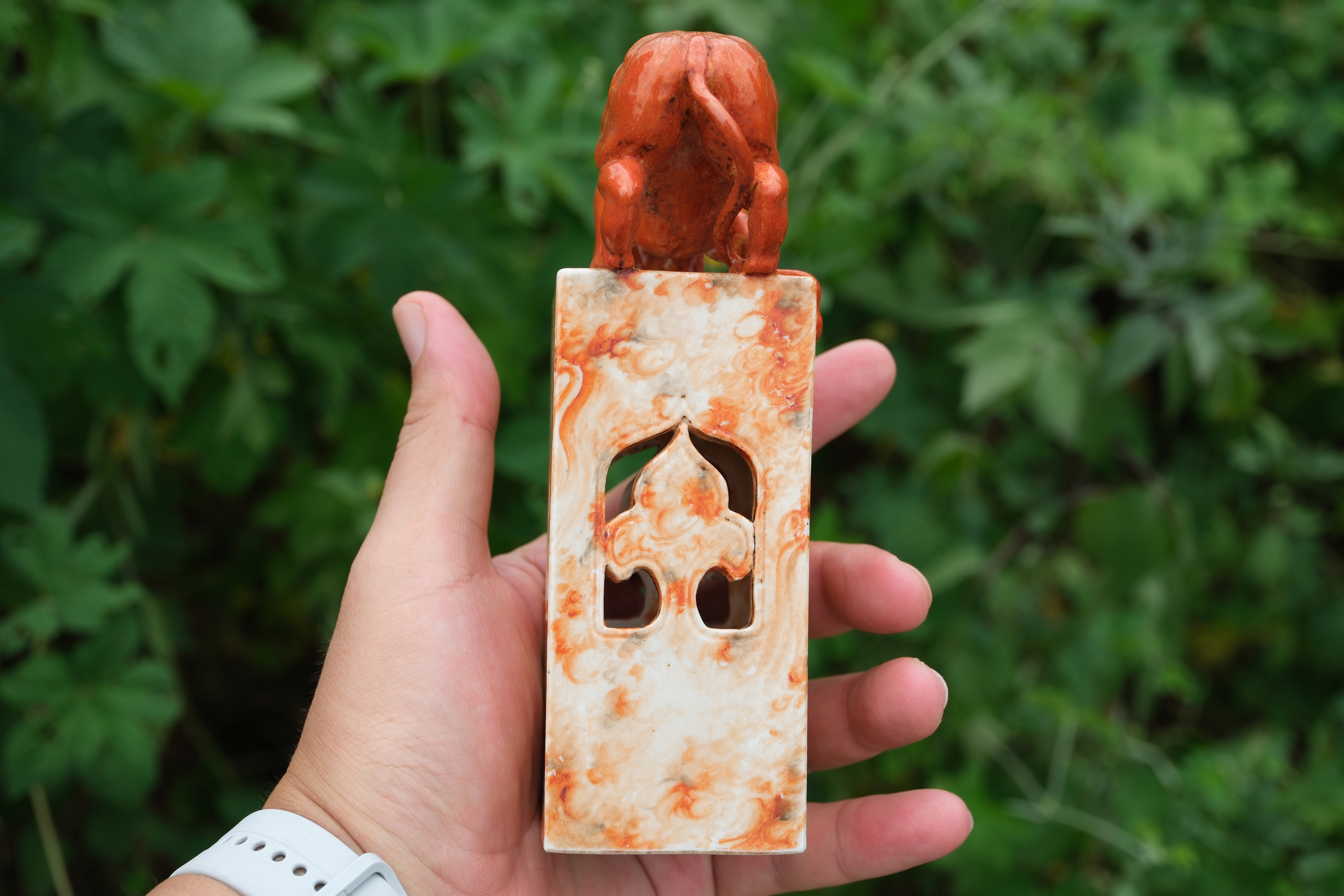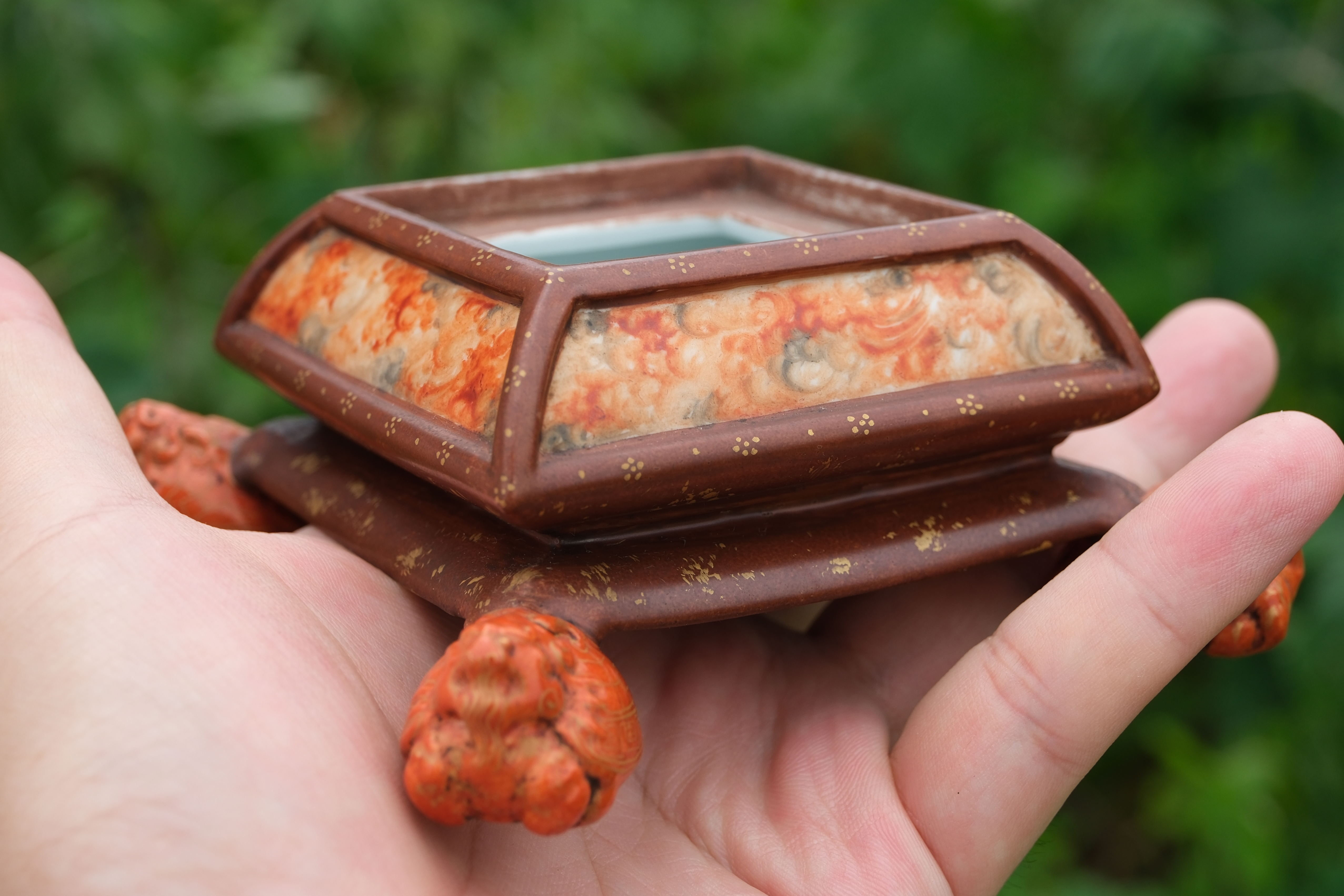 0214 Qianlong-Mark Porcelain Censer with Foo Lion Finials & Wood-Grain Glaze
