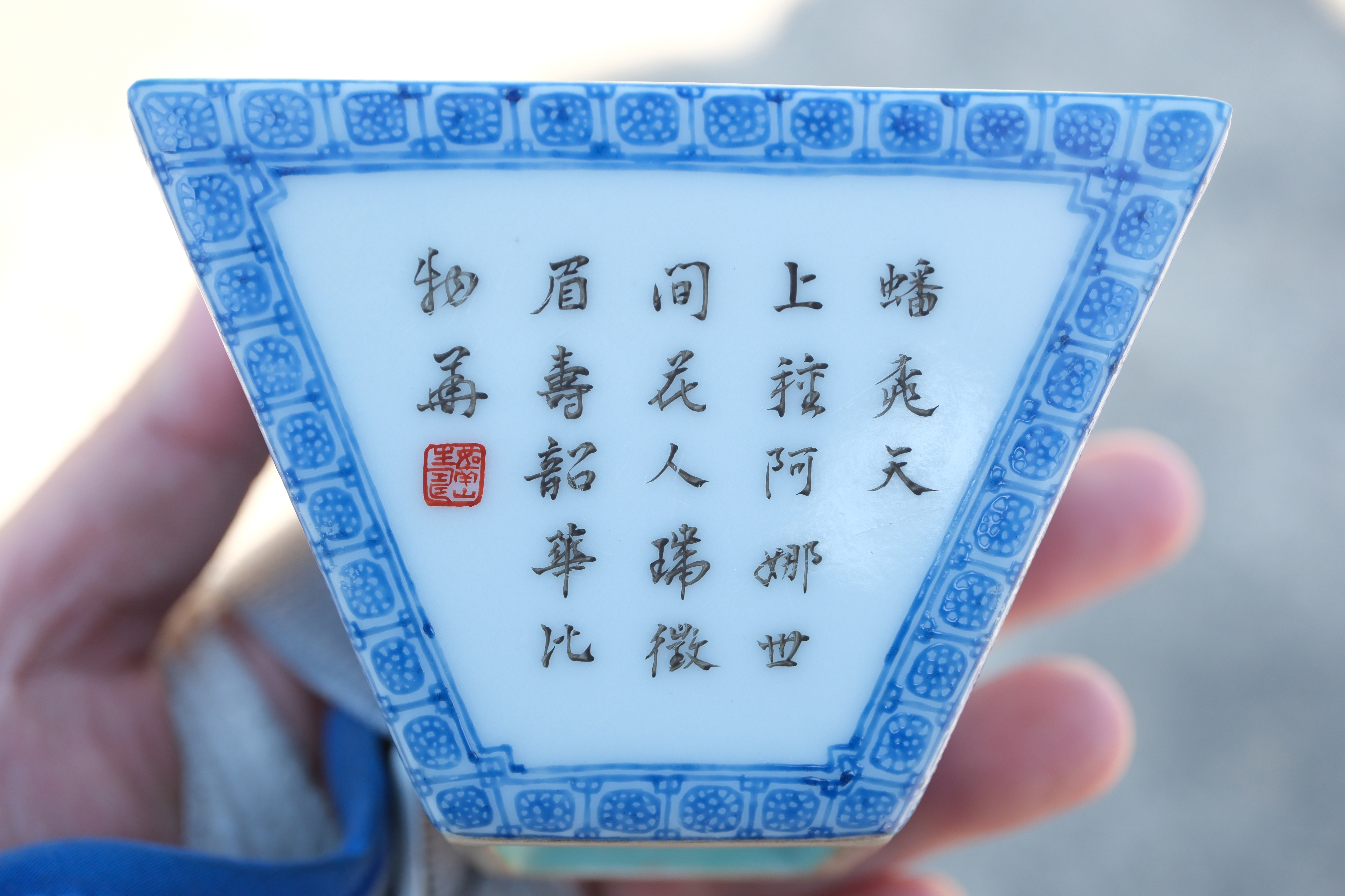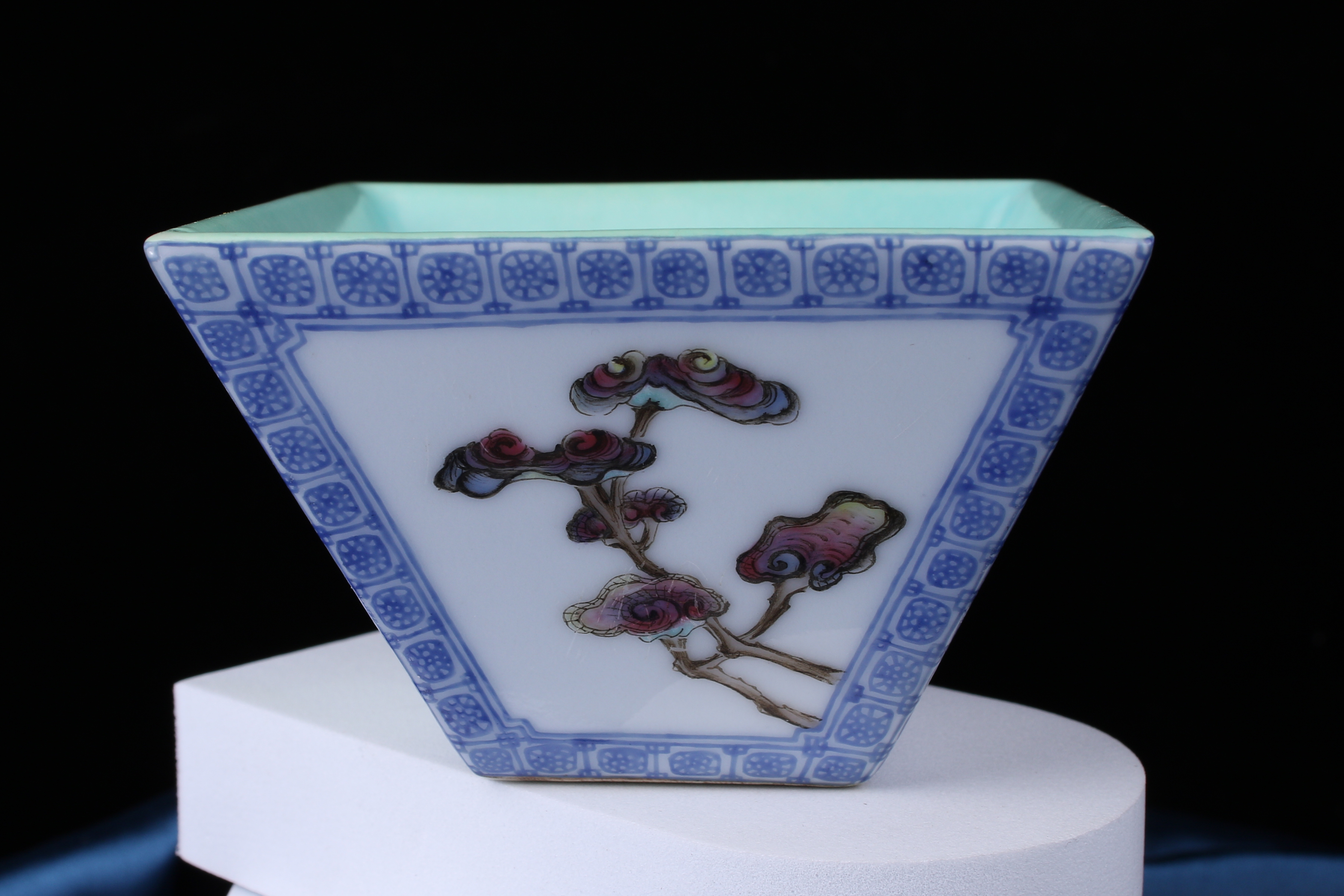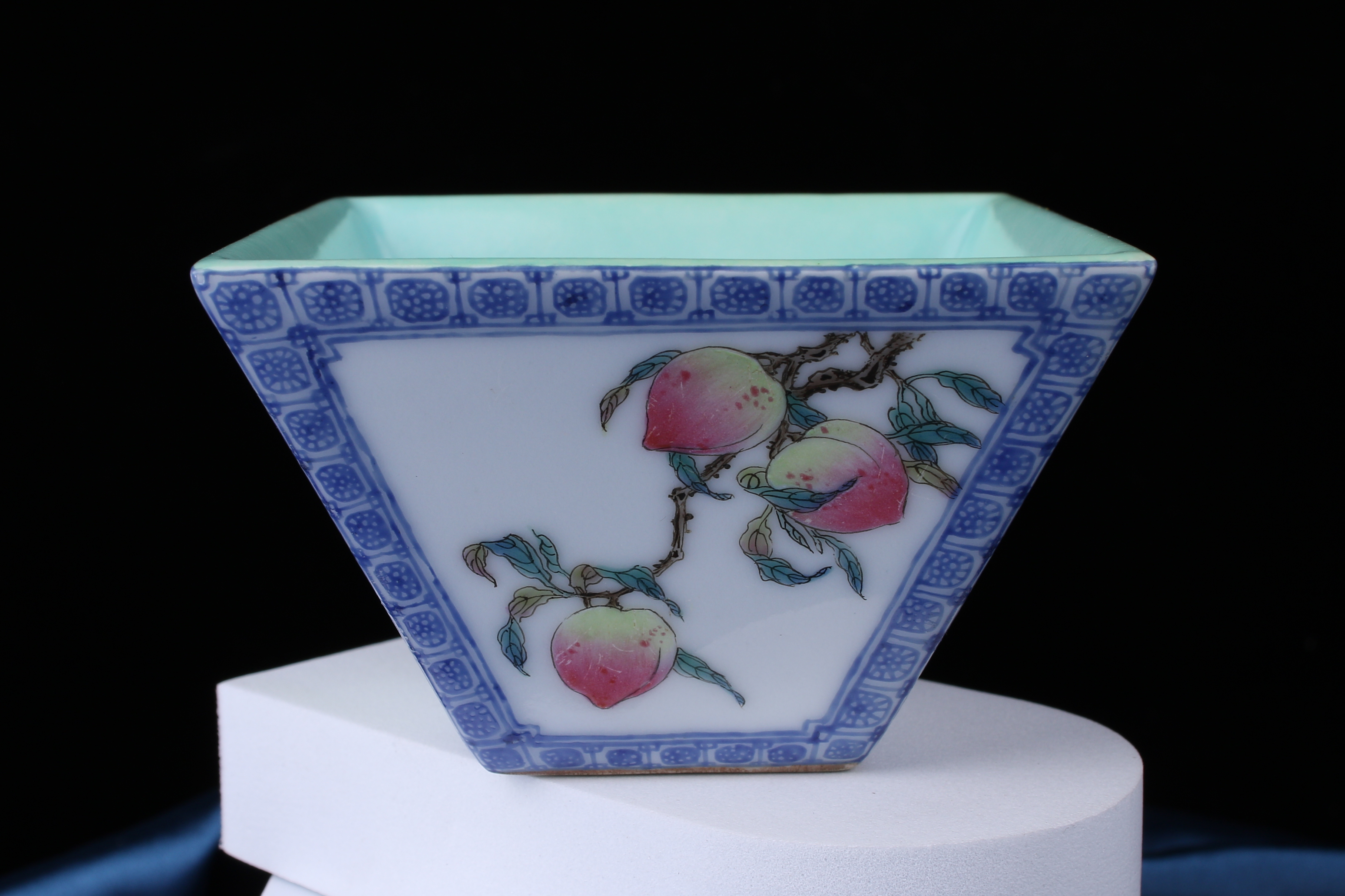 A0050. Famille Rose Square Bushel Cup with 'Auspicious Fruit' Peaches & Lingzhi