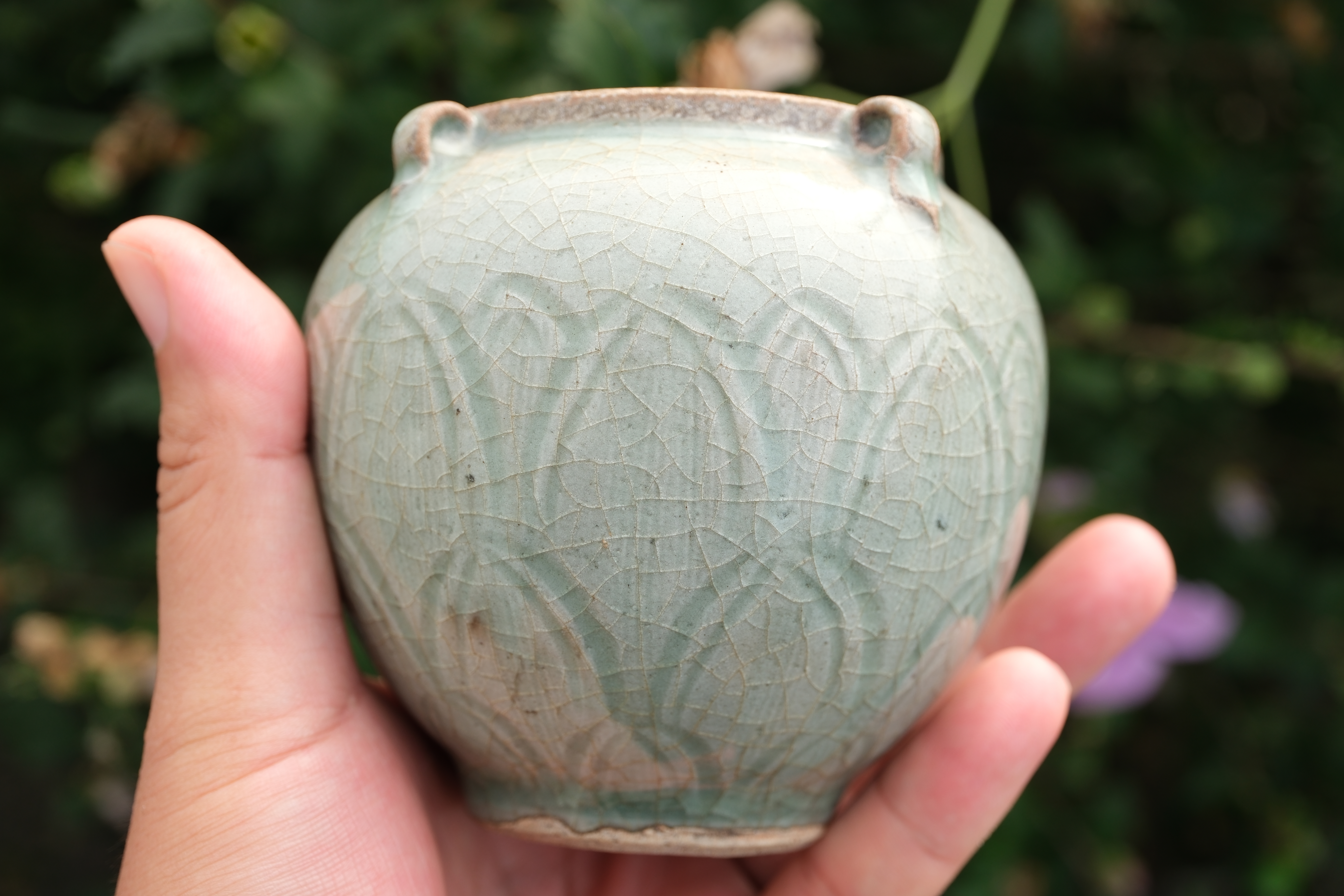 0440 Longquan Celadon Jar and Cover, Carved with a Peony