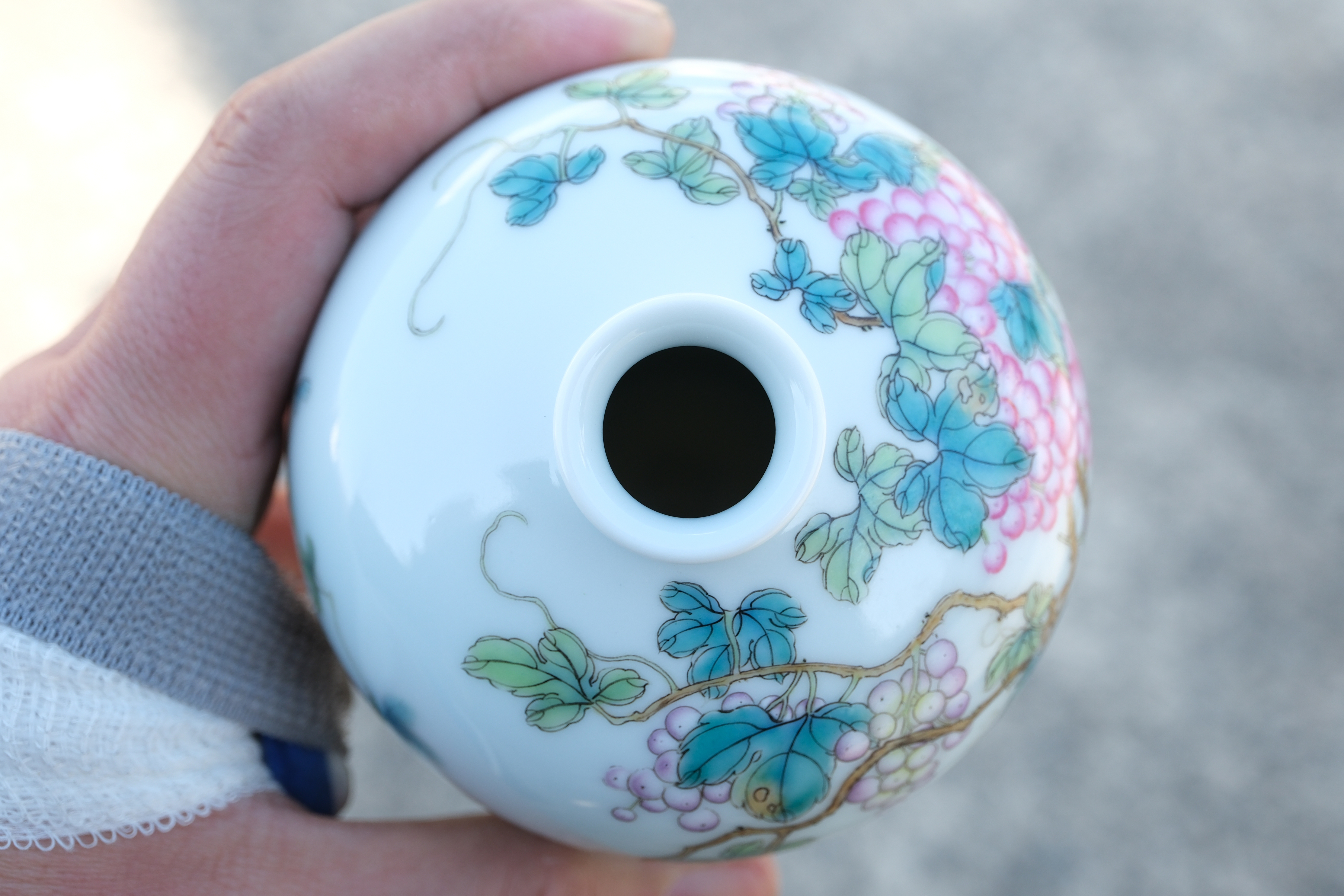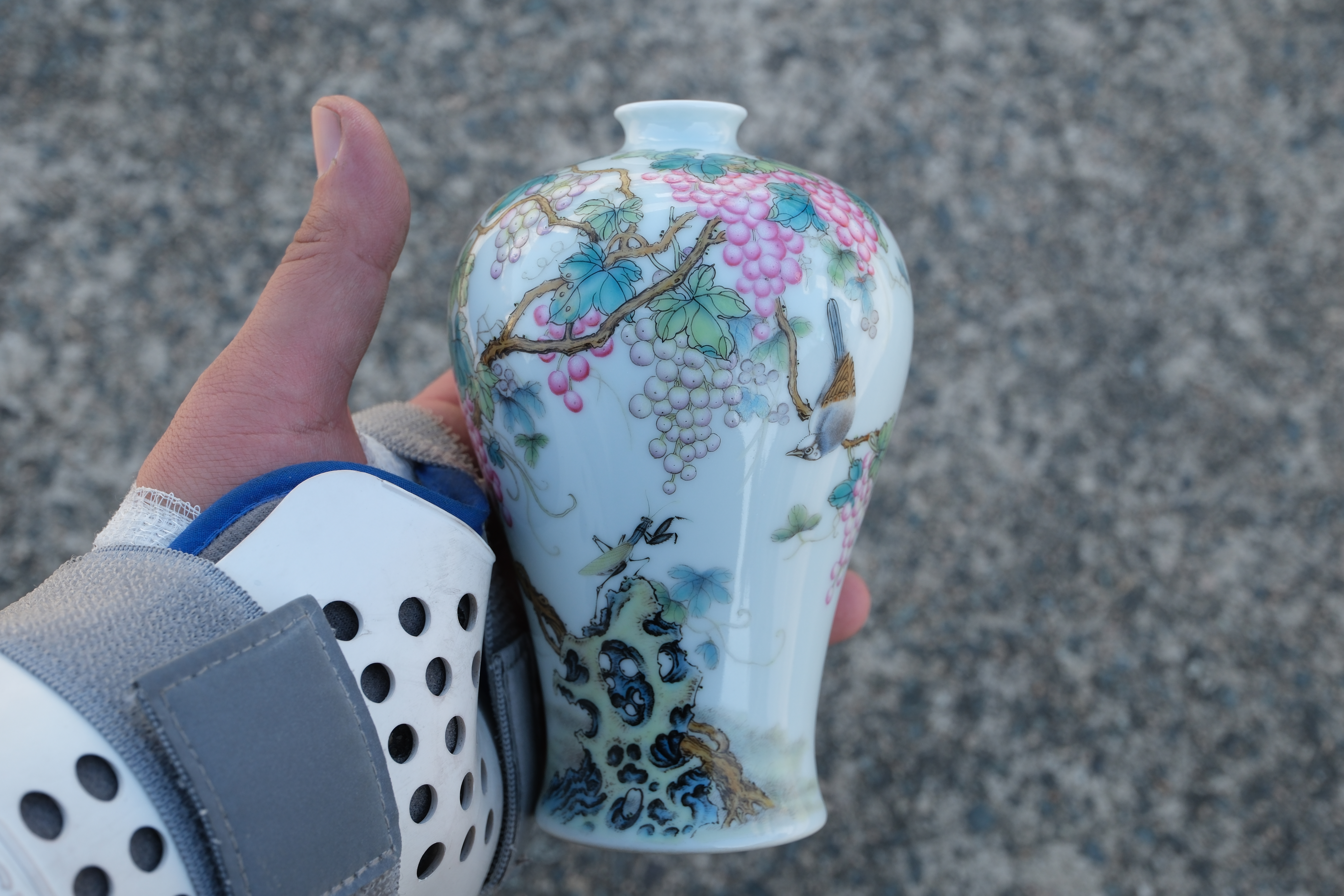 A0017. Falangcai Enamel 'Grapes and Mantis' Meiping Vase