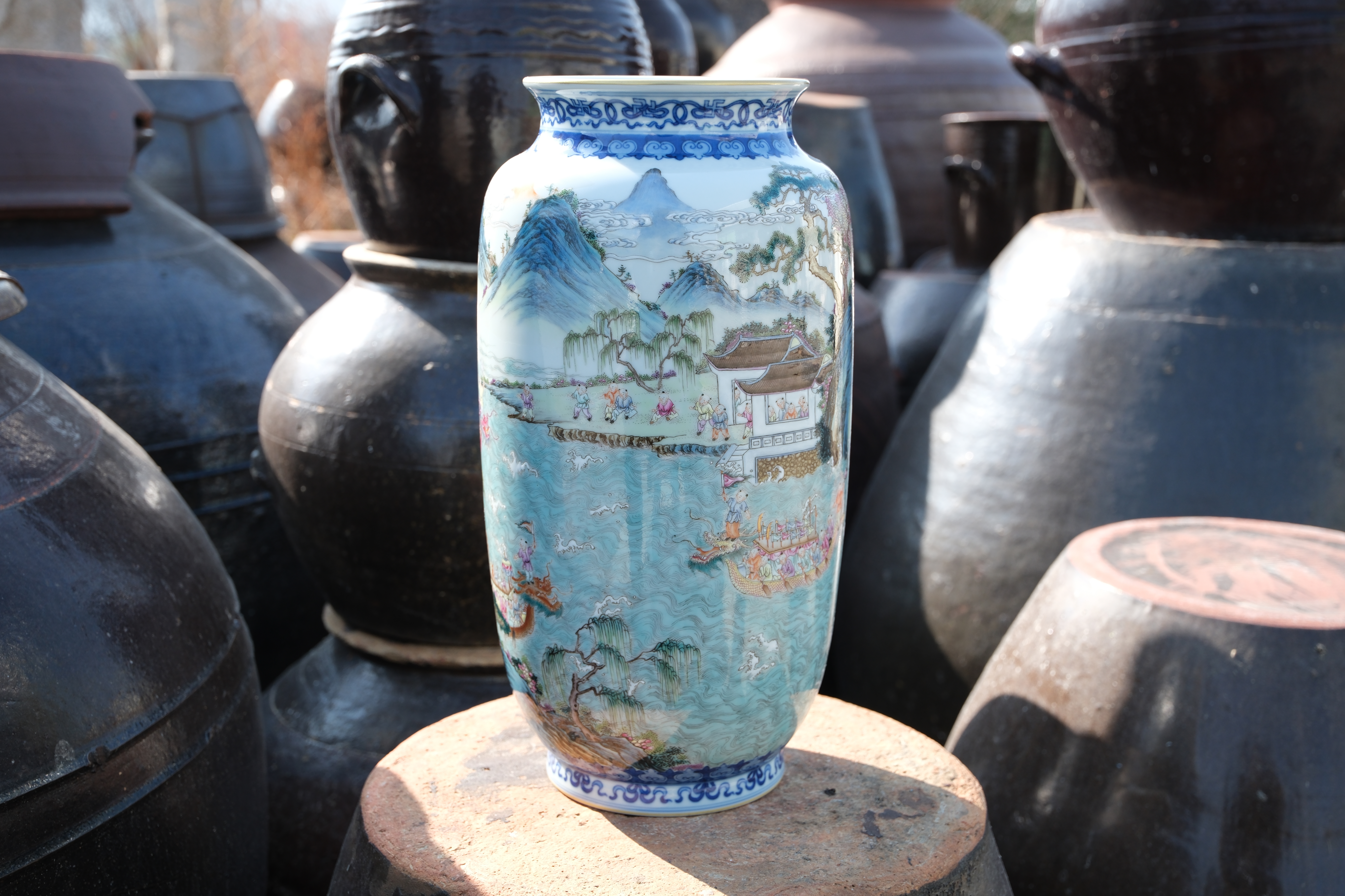 A0023. Famille Rose 'Boys at Dragon Boat Race' Winter Melon Vase