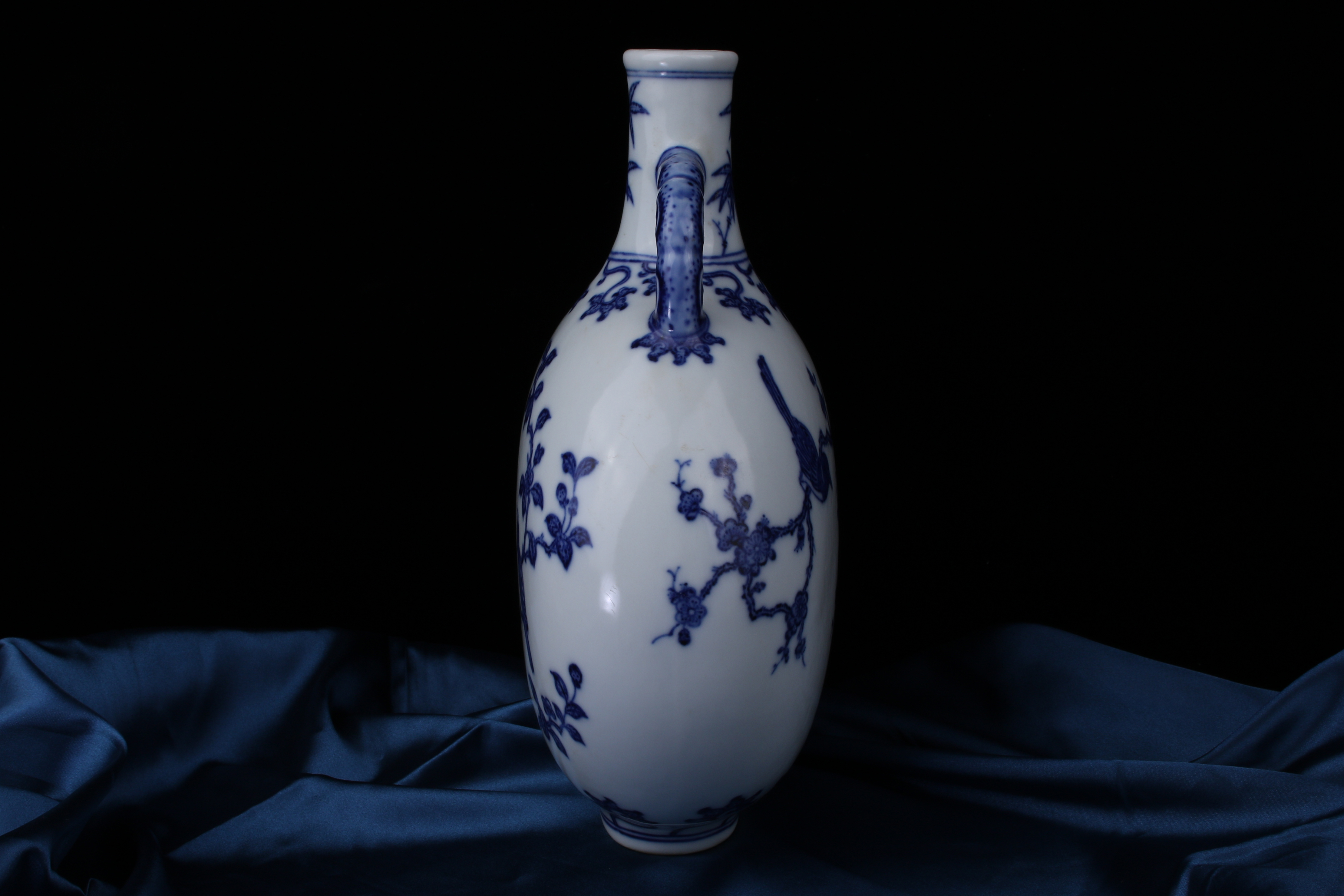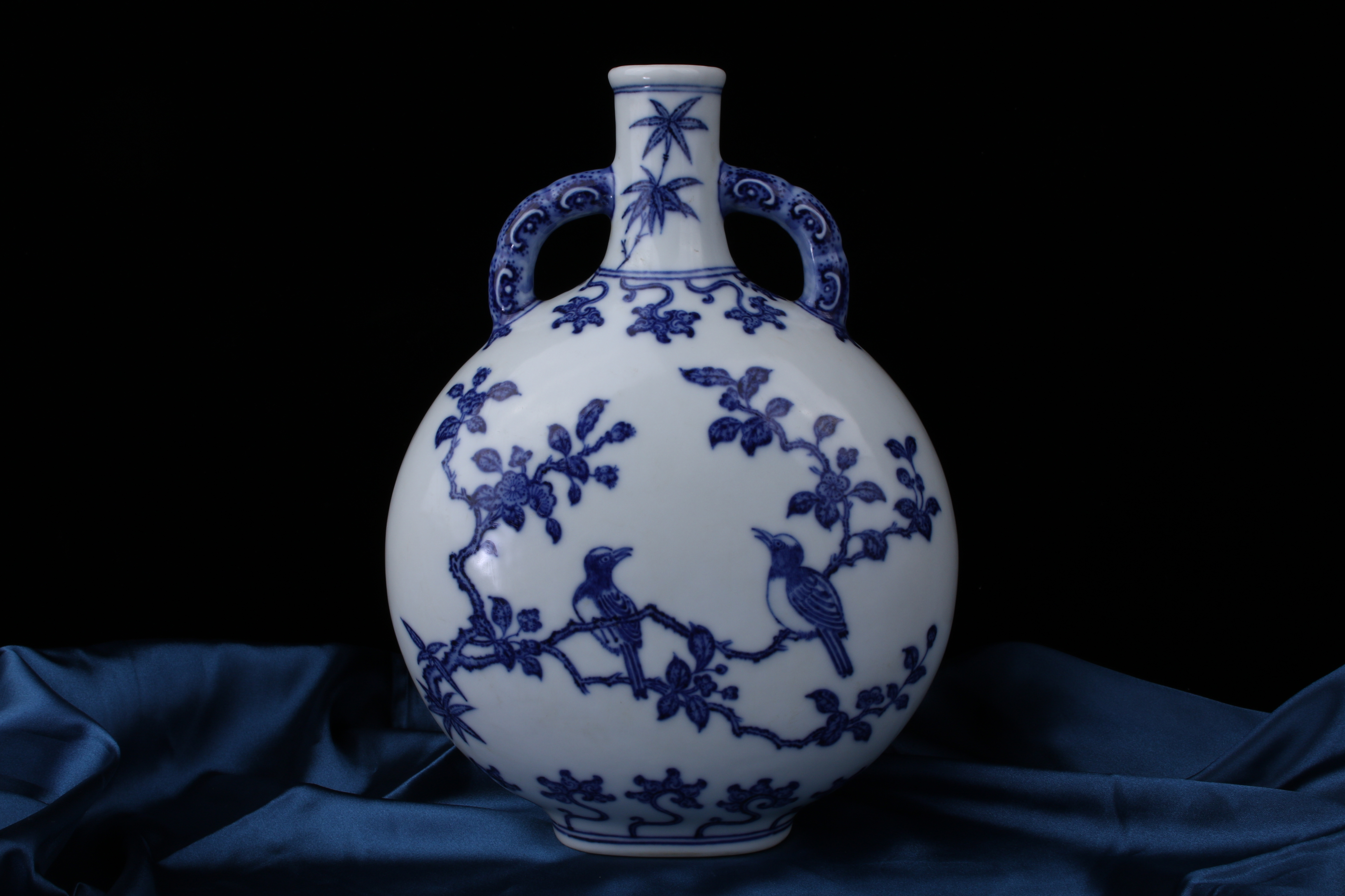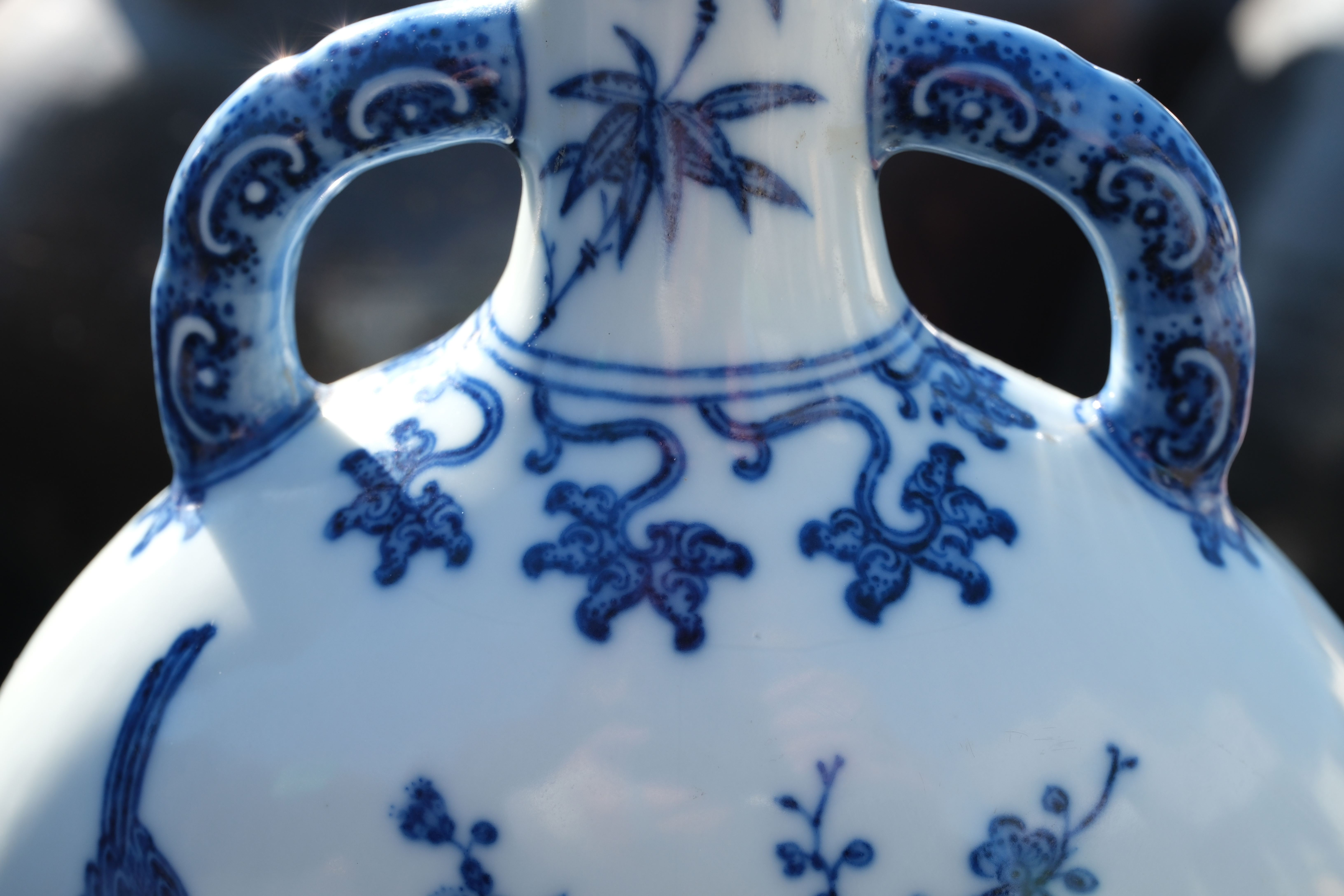 A0051. Blue and White 'Xi-Shang-Mei-Xiao' Motif Flattened Moon Flask