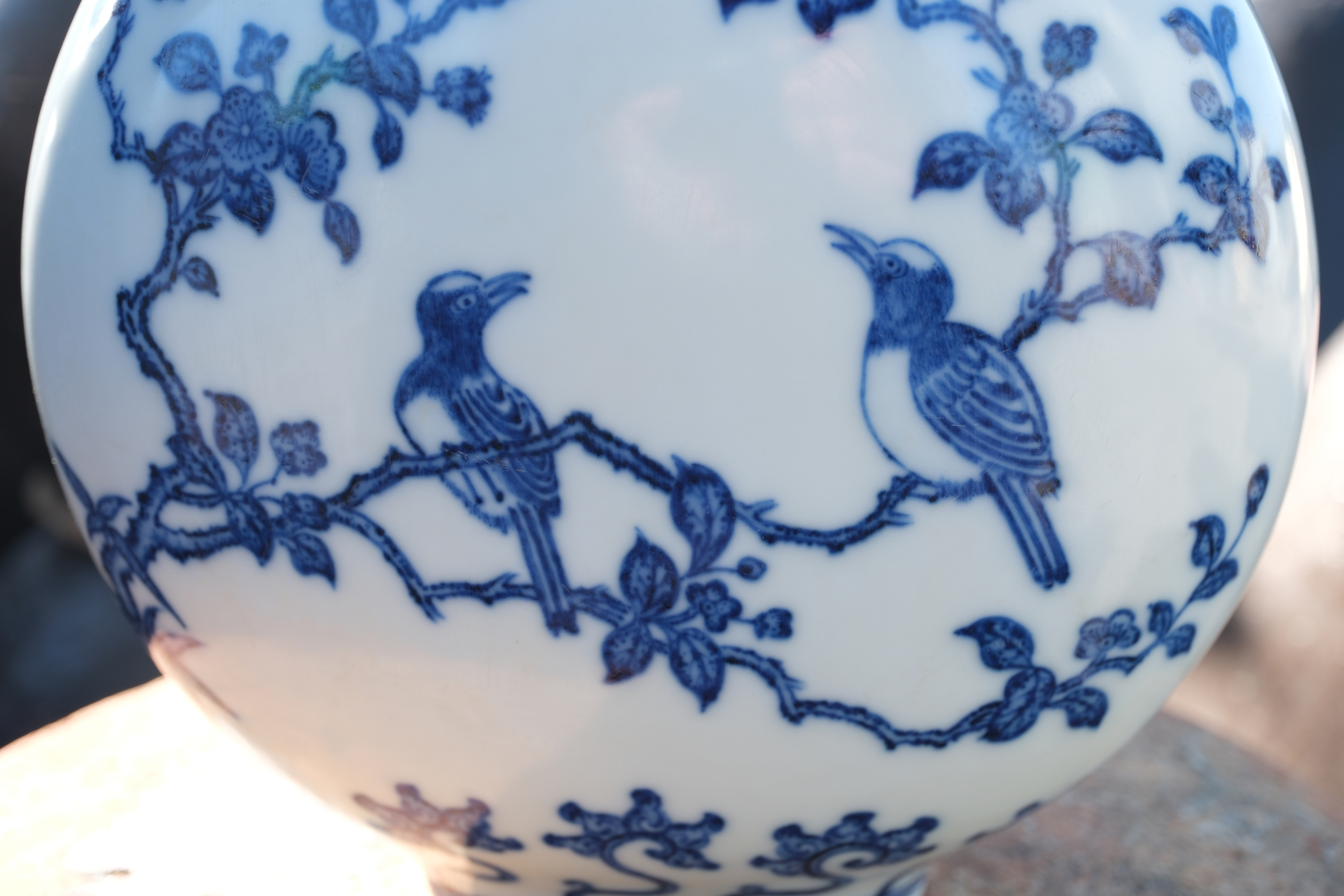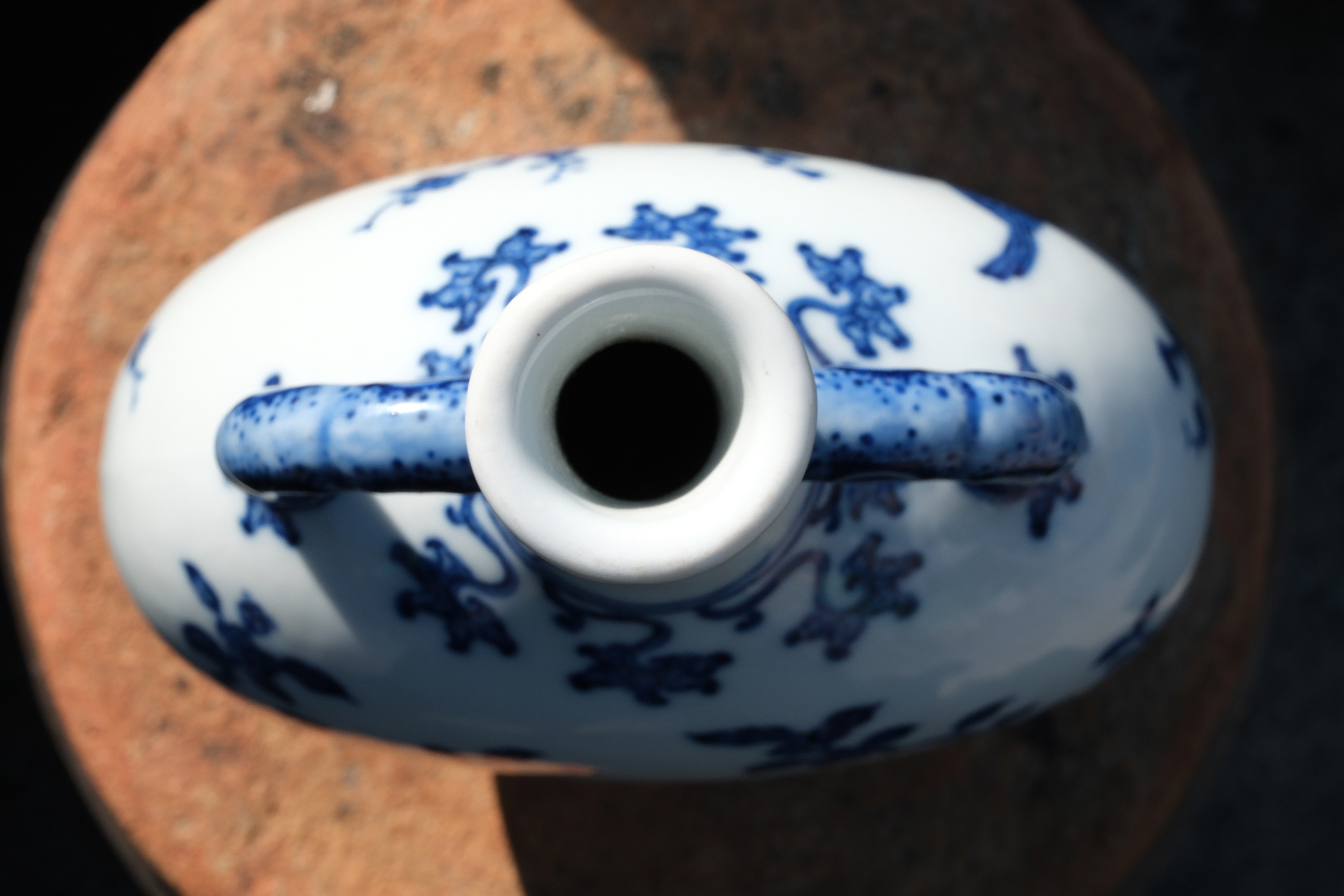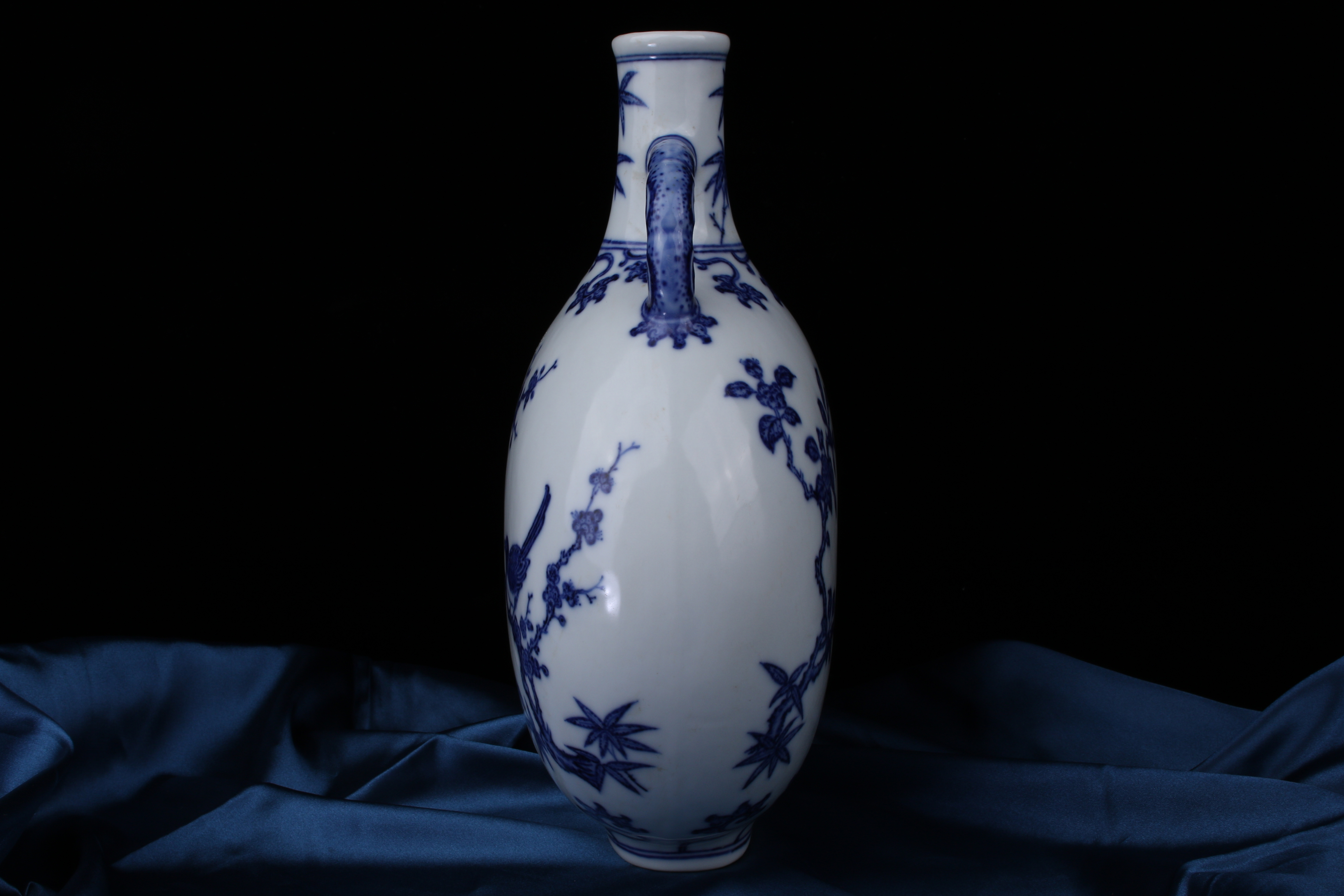A0051. Blue and White 'Xi-Shang-Mei-Xiao' Motif Flattened Moon Flask