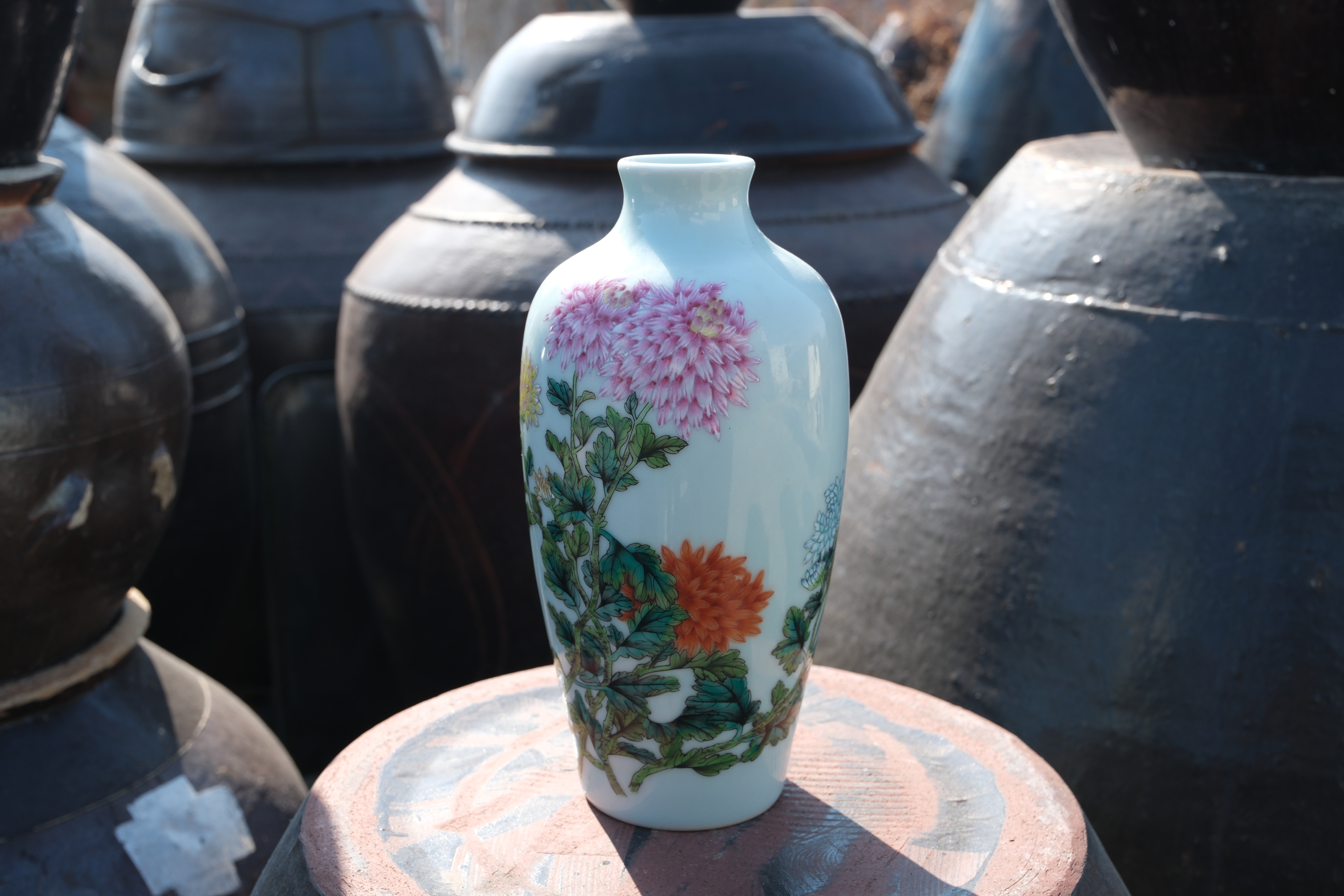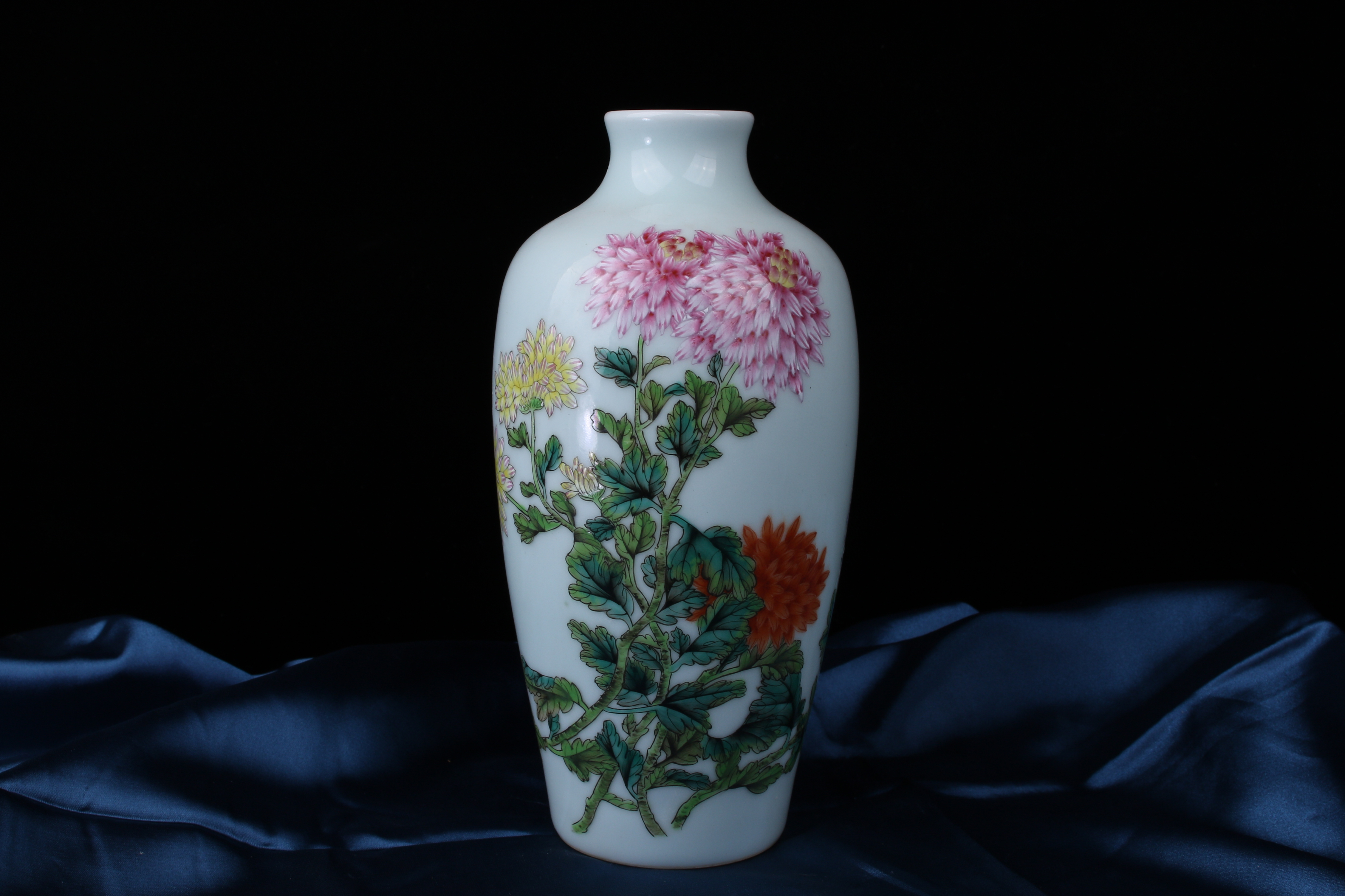 A0109. Famille Rose Melon Vases with Chrysanthemums B